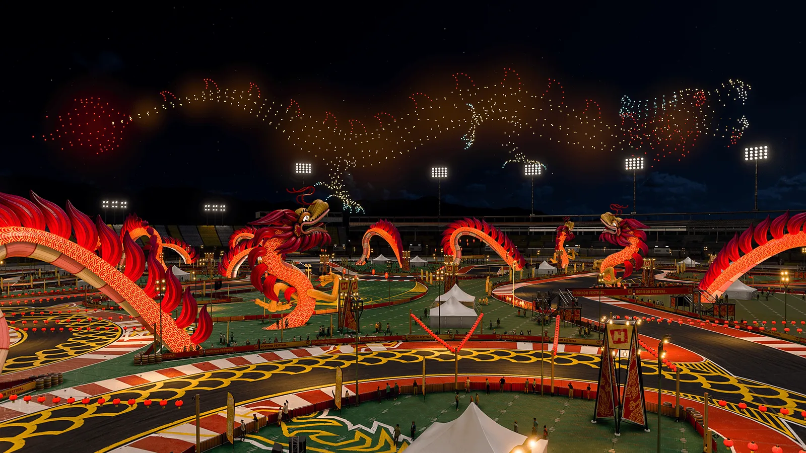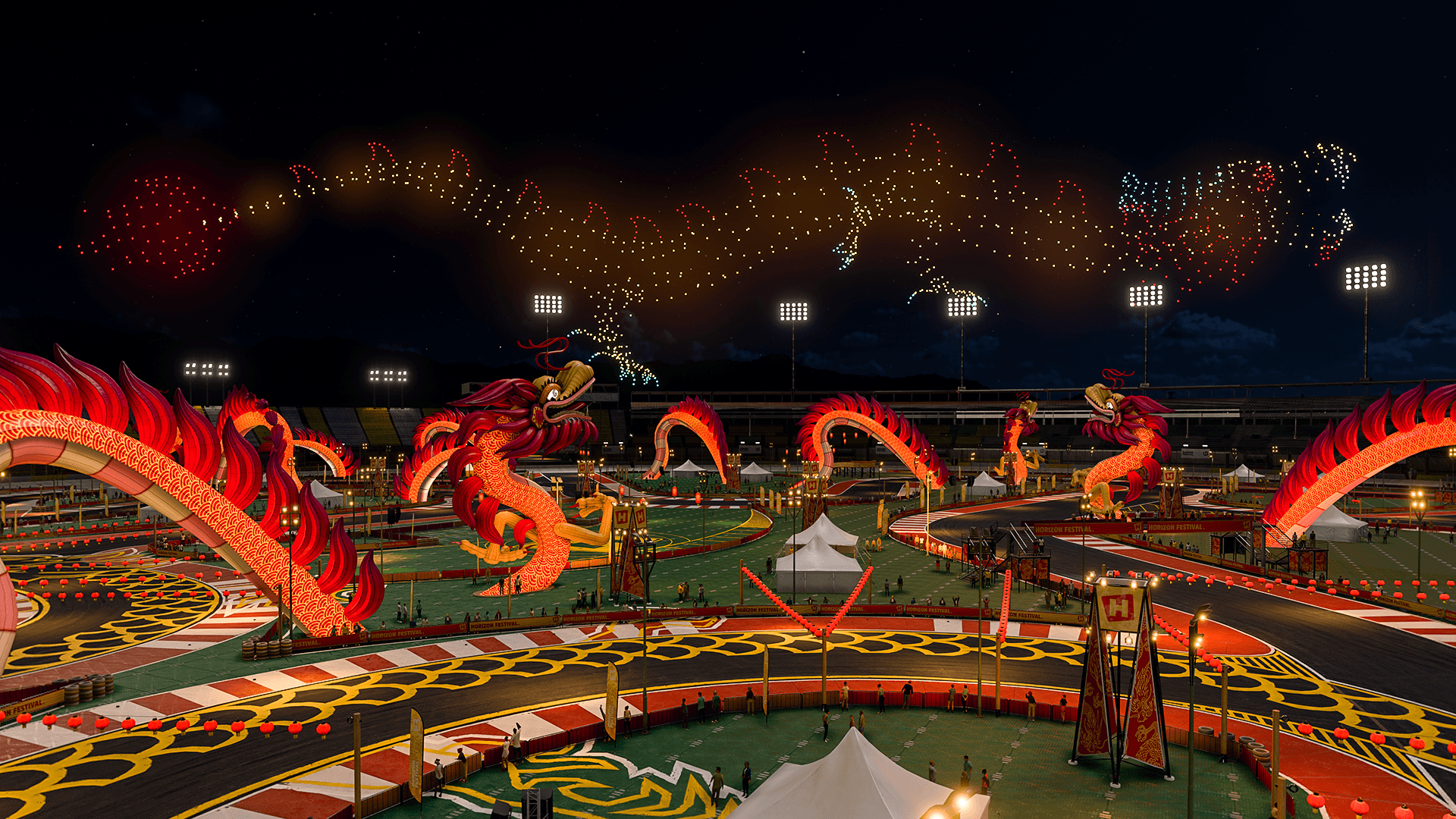 タイヤを焦がすレースを終えた後は、旧正月の4週間にわたり、ドリフトアリーナで夜間ドローンショーが開催されます。