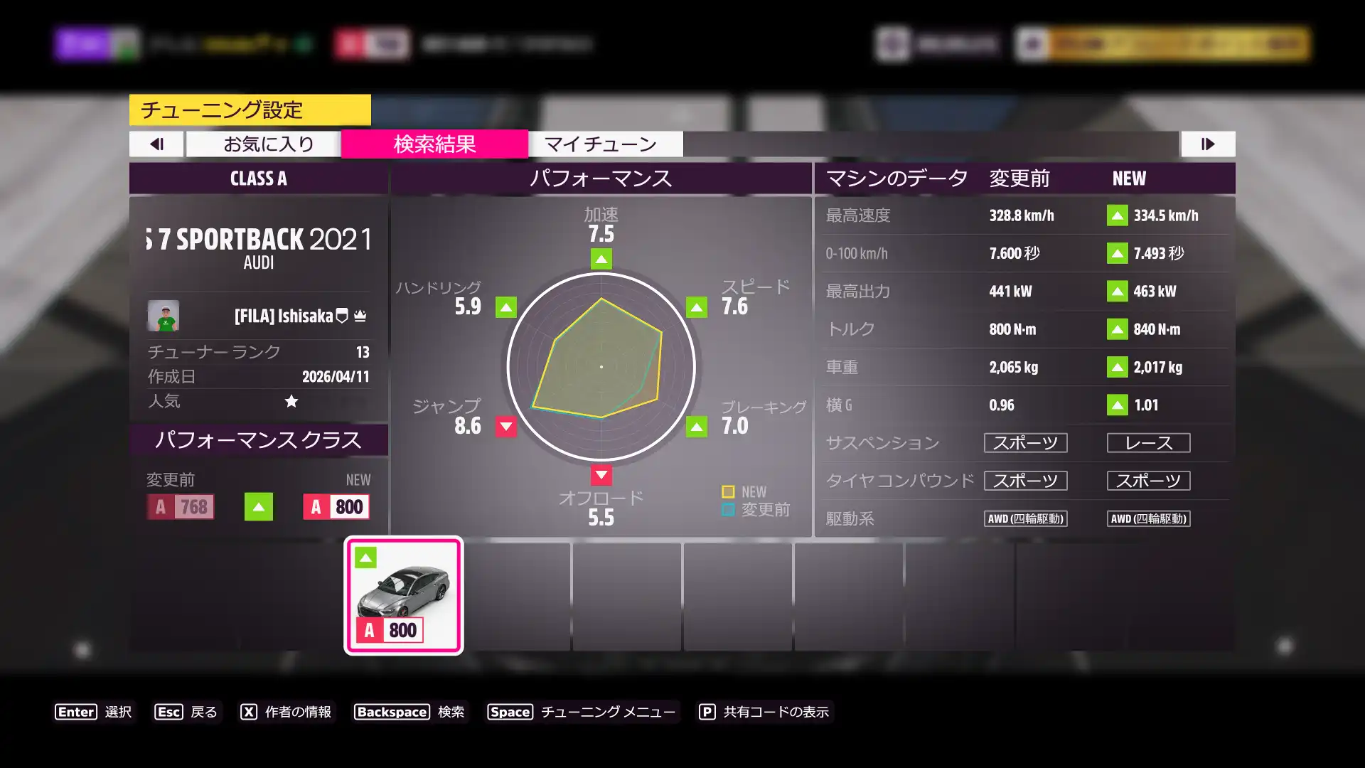 2021 Audi RS 7 Sportbackゲット。Aクラスのチューンを公開しました。共有コードは、316 619 289 です。