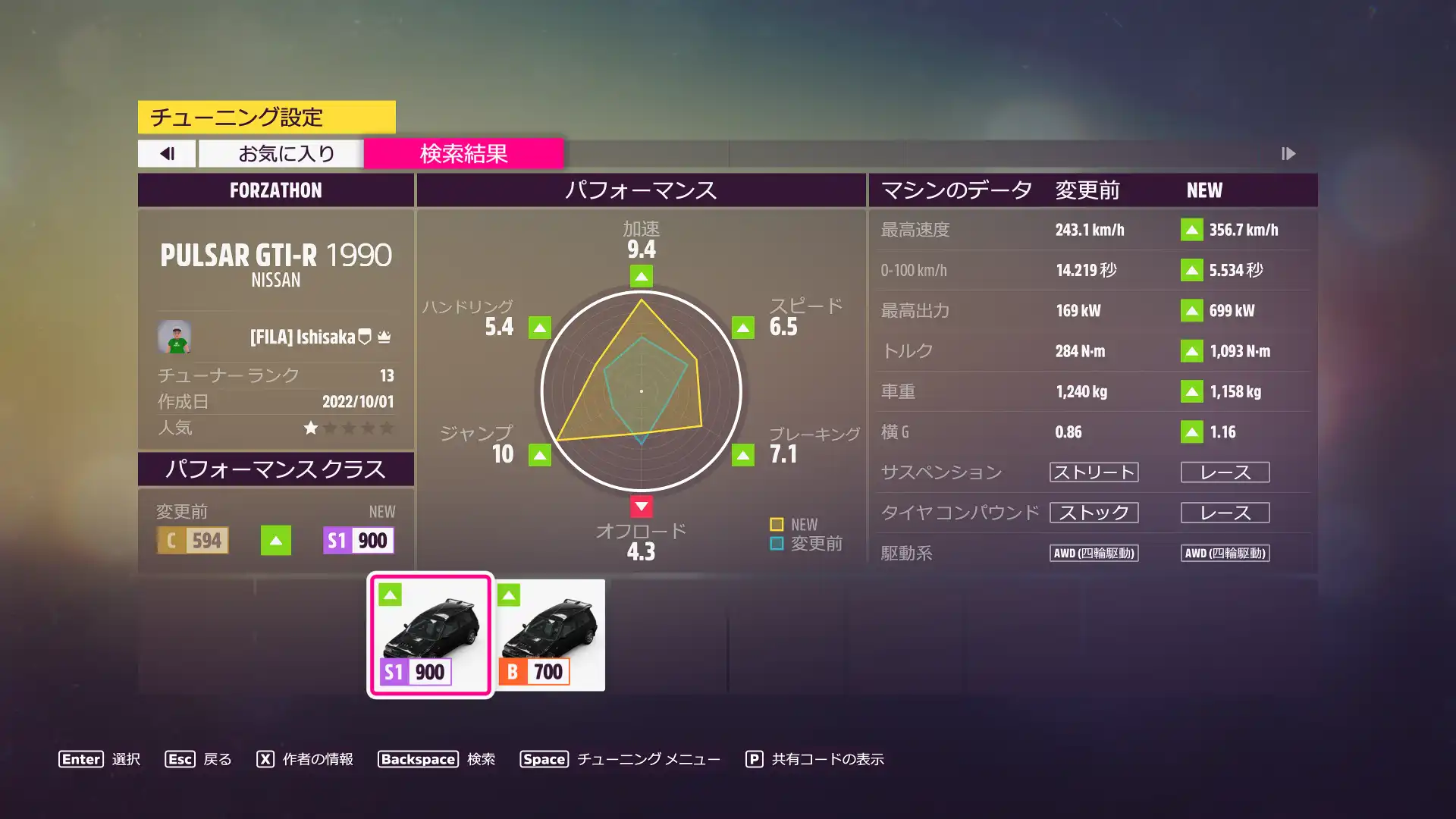 次回Weeklyで322km/hを出す必要があるので、そのための、 1990 Nissan Pulsar GTi-R.のチューンを公開しています。共有コードは、624 025 373 です。