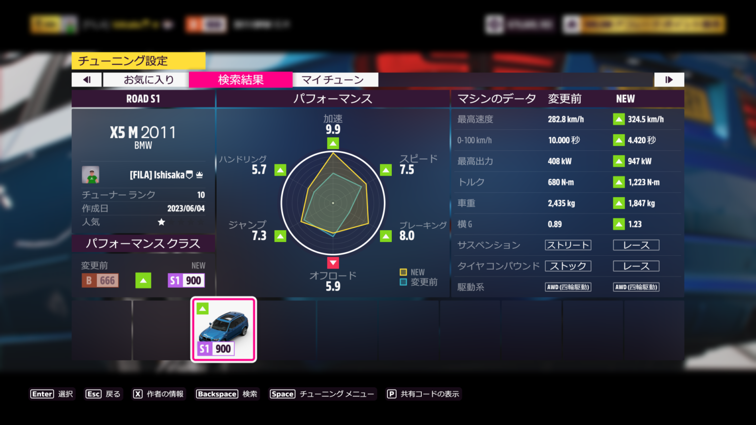 次回Weekly対象車、2011 BMW X5 Mのチューンを公開しています。共有コードは 176 175 076 です。