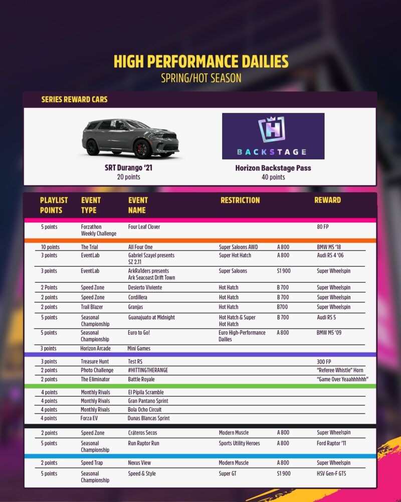 SPRING | HOT SEASON Here are the details on this week’s events and rewards. Share tips along with your tuning setup code...