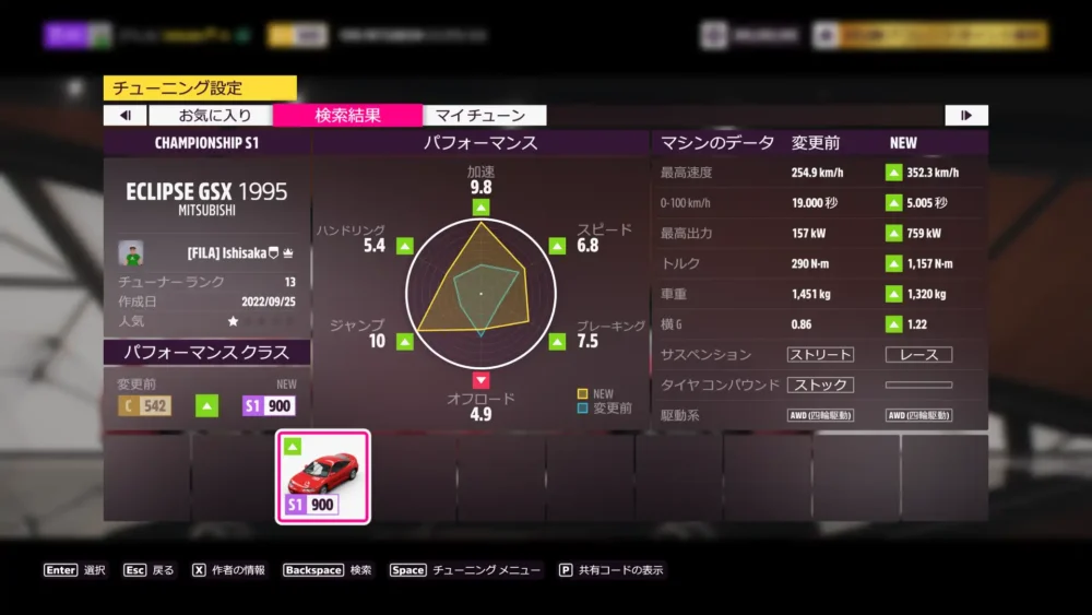 ウィークリー終了。1995 Mitsubishi Eclipse GSXのS1チューンを公開しています。共有コードは、240 987 054 です。