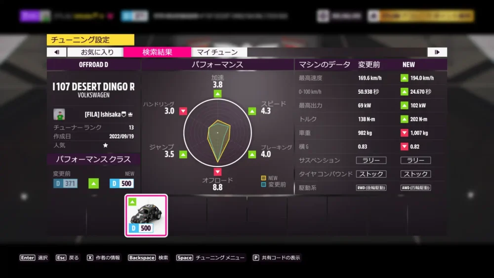 ウィークリー終了。1970 Volkswagen #1107 Desert Dingo Racing Stock BugのDクラスチューンを公開しています。共有コードは、563 161 514 です。