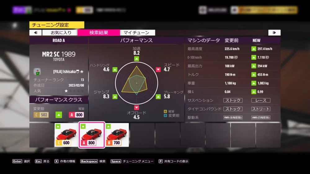 ウィークリー終了。1989 Toyota MR2 SCのAクラスチューンを共有しています。共有コードは、145 032 268 です。