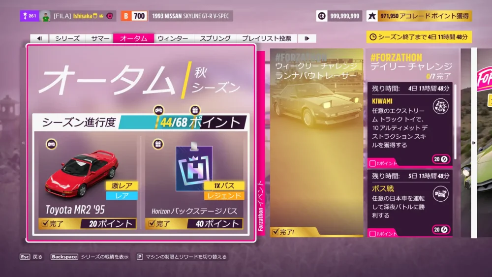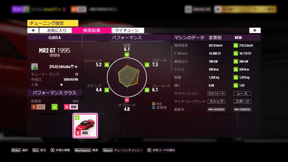 次回Weeklyの対象車、2002 Mazda RX-7 Spirit R Type-A のS1クラスチューンを公開しています。共有コードは、112 667 190 です。