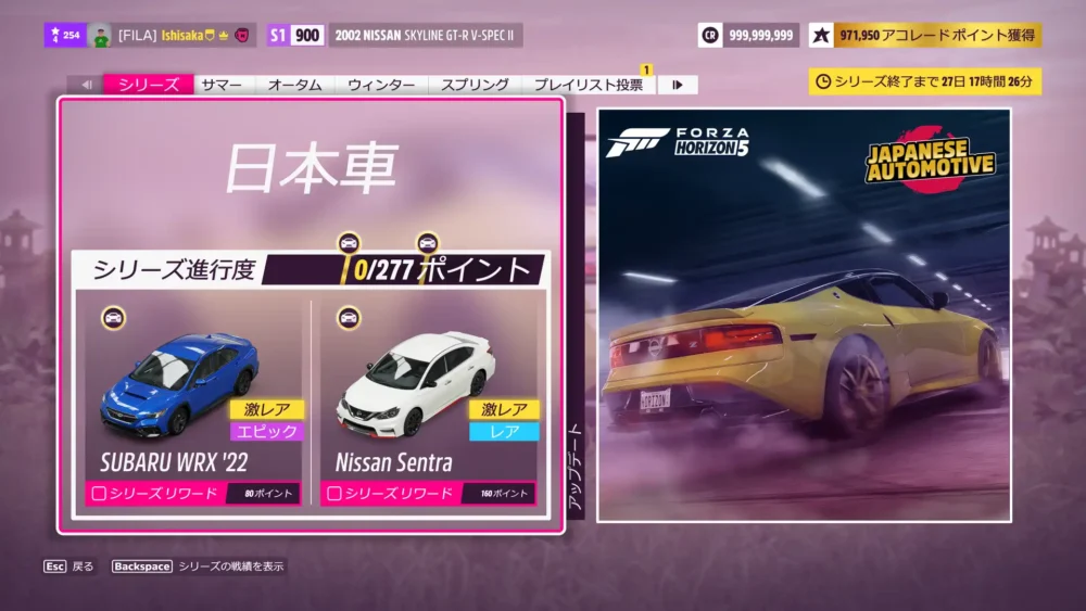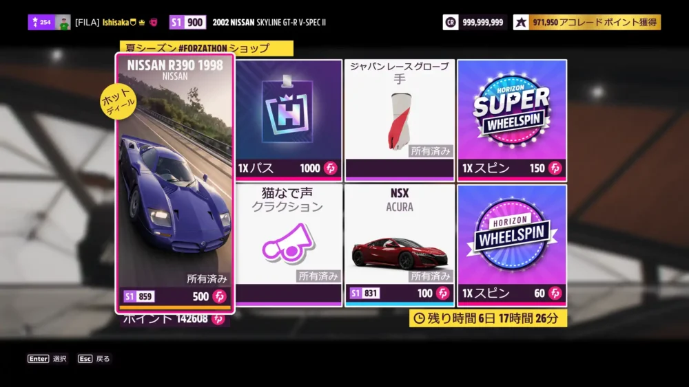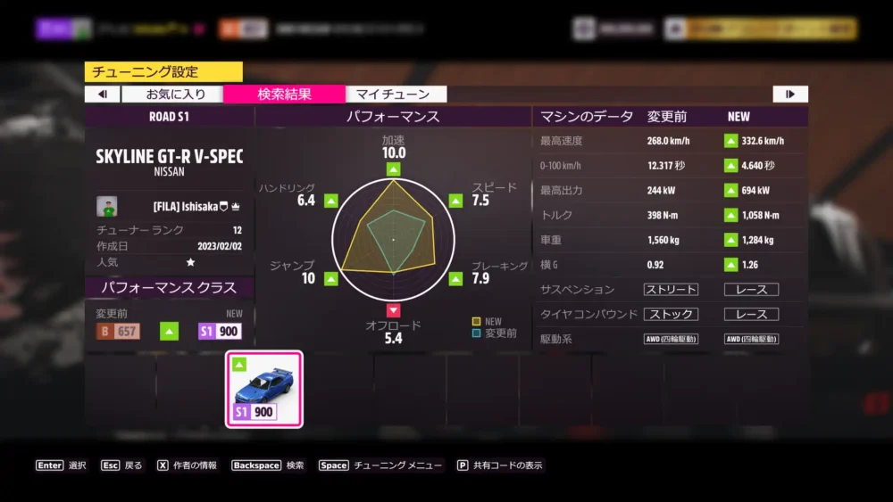 ウィークリー終了。2002 Nissan Skyline GT-R V-Spec IIのS1チューンを公開しています。共有コードは、313 411 057 です。
