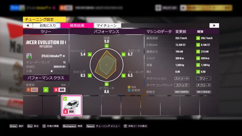 1995 Mitsubishi Lancer Evolution III GSRのAクラス、ラリーチューンを公開しています。共有コードは、490 960 899 です。