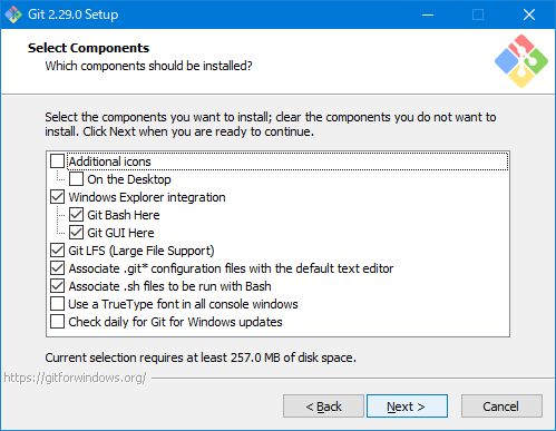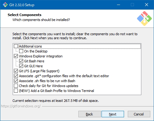 Git LFS(Large File Support)はLFSのインストールをするかしないかの選択をします。LFSは設定されたファイルをGitのレポジトリ内には収めず、ハッシュと実際のファイルの参照先だけを収め、実際のファイルは別の場所に置くことで、Gitのパフォーマンスを改善する仕組み/ソフトウェアです。通常はチェックを付けてインストールすることで問題ないと思いますが、チームで作業されている方はチームリーダー等に確認してください。