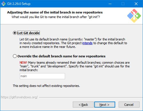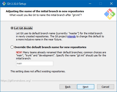 Git initで最初に作成されるブランチ名を選択します。Let Git decideは従来通り最初に作られるブランチは「master」となります。Override the default branch name for new repositoriesでは下のテキストボックスに指定したブランチ名がgit initコマンドで最初に作られるブランチ名となります。GitHubの仕様変更にあわせて最初のブランチを「main」にしたい場合にはここで設定しておくと良いでしょう。