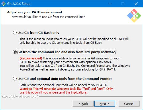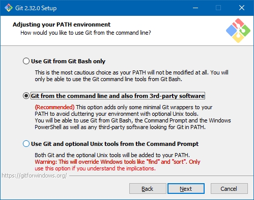 Use Git and included Unix tools from the Windows Command Promptを選択した場合には、インストーラーは環境変数pathにC:\Program Files\Git\cmdとC:\Program Files\Git\mingw64\bin, C:\Program Files\Git\usr\binの三つを追加します。この三つが追加されることで、gitだけでなく、他のUnix由来のツール、lsやlessなどをWindowsのコマンドプロンプトから使用できるようになります。逆にそれらが不要でればRun Git from the Windows Command Promptを選択しておけば良いです。