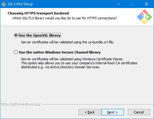 gitでHTTPSを使ってフェッチ/プッシュ/プルするときにOpenSSLが持つルート証明書を使用するか、WindowsのSecure Channelのルート証明書を使用するか決定します。GitHubやBitBacket等のレポジトリサービスを利用する場合や、Linuxベースのローカルサーバー上のGitのリモートリポジトリーに接続する場合にはOpenSSLで基本的に問題ありません。企業等でTeam Foundation ServerやWindowsサーバー/IISでGitリポジトリサーバーを運用していて、そこへのアクセスにカスタムの認証局に発行された証明書が必要な場合、特にその証明書がADで配布されている場合には必ず後者を選択します。