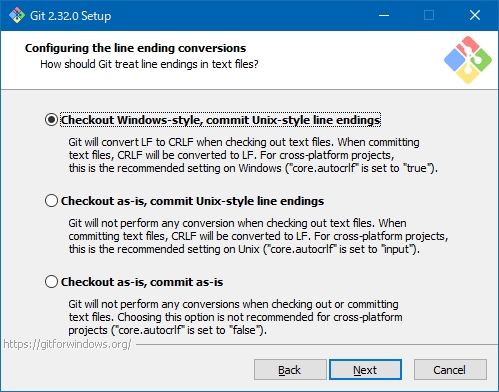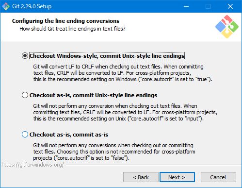 多くのサイトやインストール解説記事では一番上のCheckout Windows-style, commit Unix line endingsを選択するように薦めていますが、私は一番下のas-isをお勧めします。