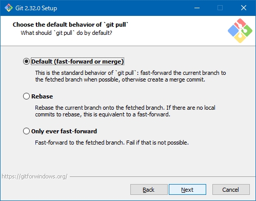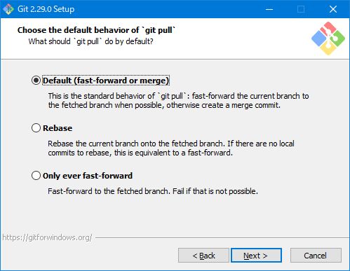 git pullの方法について設定します。通常はDefaultのままでかまいません。Rebaseを標準としたい場合にはRebaseをfast-forwardのみをデフォルトにしたい場合にはOnly ever fast-forwardを選択します。