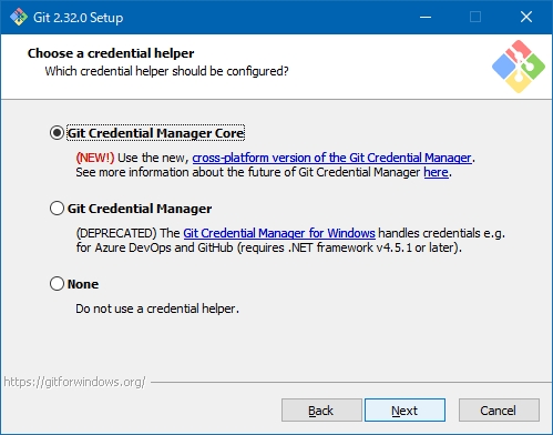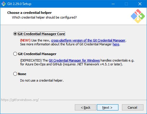 Git credential managerのセットアップを選択します。通常は更新される予定のGitHubへのサインインに対応しているGit Credential Manager Coreを選択します。何らかの理由で旧バージョン(サポート終了)のGit Credential Managerが必要な人はそちらを選択します。権限管理機能を何も必要としていない場合にはNoneを選択します。