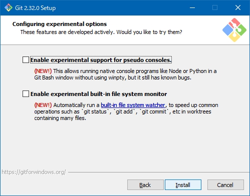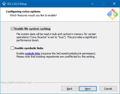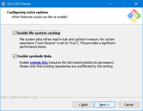 下のEnable symbolic linksはシンボリックリンクの使用/不使用の選択です。チェックが入っているとGitでシンボリックリンクを使用できるようになりますが、WindowsのシンボリックリンクはPOSIXのそれとの互換性が必ずしもあるわけではないので、注意が必要ですが、たいていの場合は問題無く動作します。また、Windows 10 Fall Creators Update以降では開発者オプションをONにすることでシンボリックリンクの操作に管理者権限が必要なくなったので利便性が向上しています。