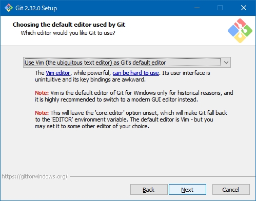 この設定は、インストーラーがシェル呼び出しでgit --system core.editorコマンドでシステム設定として設定するので、ユーザー毎の.gitconfigは編集しません。したがって、ユーザープロファイルの.gitconfigでエディタ設定している場合に設定上書きされてしまうことはありません。逆に言うとユーザープロファイル($home)の.gitconfigでエディタ設定がされていない場合には、この設定で設定したエディタが使用されます。