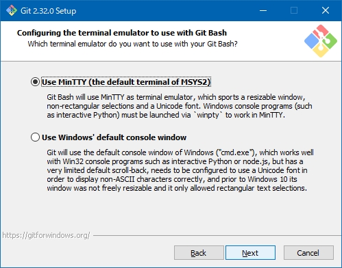 次にGit出使用するコンソールをCygwinで使用されているMinttyを使用するか、Windowsの標準コンソールを使用するか選択します。特にこだわりが無ければMinttyを選択しておくのが無難ですが、既にConEmuやConsole2を使われている方や、Windows 10で機能強化されてまともになったWindowsの標準コンソールが気に入っている方は、「Use Windows’s default console windows」を選択します。